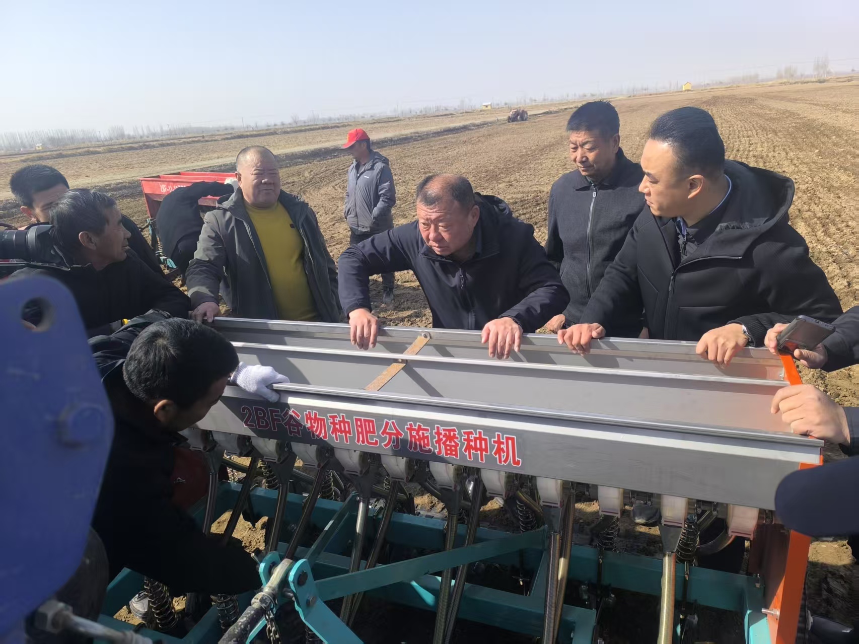 迎着正午阳光,随着一声号令,几台播种机沿着田垄匀速行驶,一粒粒饱满的种子被精准地播撒,种下新一年的希望。农户们围在机械旁,仔细聆听技术人员讲解操作要点与注意事项,现场交流热烈。