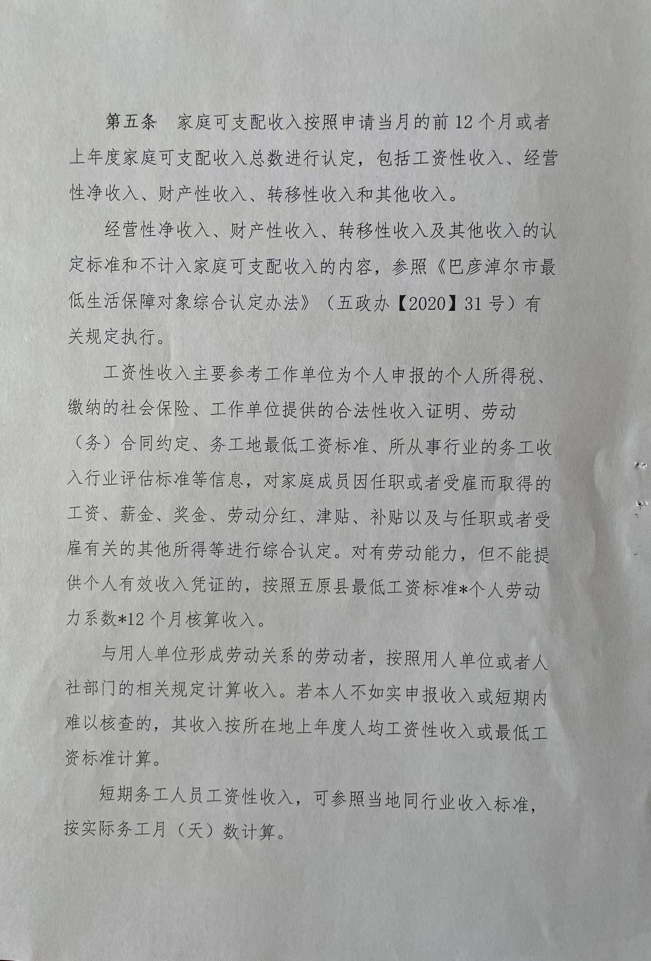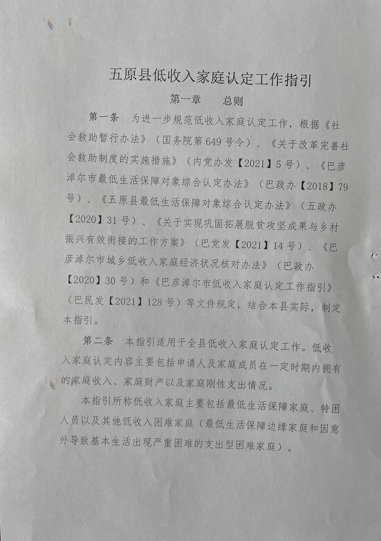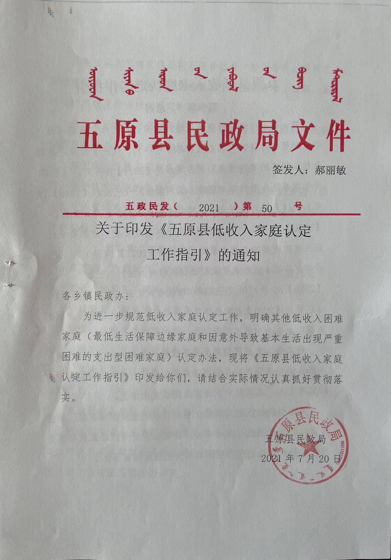 关于印发《五原县低收入家庭认定工作指引》的通知