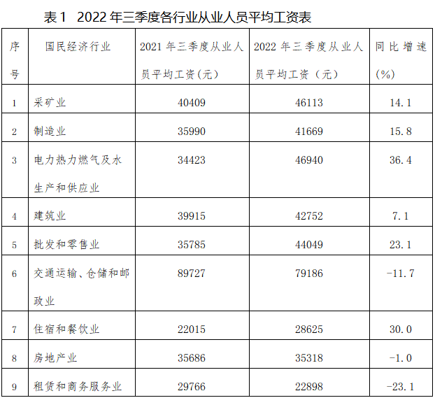 “四上”企业全部从业人员季平均工资排在前三位的行业依次是交通运输、仓储和邮政业79186元;电力、热力、燃气及水生产和供应业46940元;采矿业46113元。季平均工资排在最后一位的是租赁和商务服务业22898元。最高季平均工资是最低年平均工资的3.5倍。详见表1。