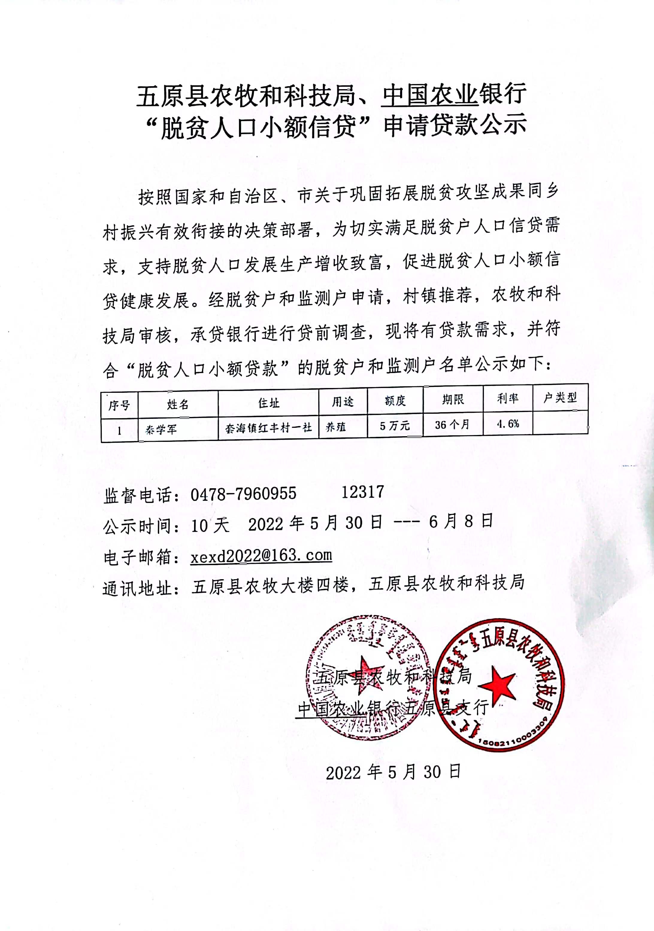 五原县农牧和科技局、中国农业银行“脱贫人口小额信贷”申请贷款公示