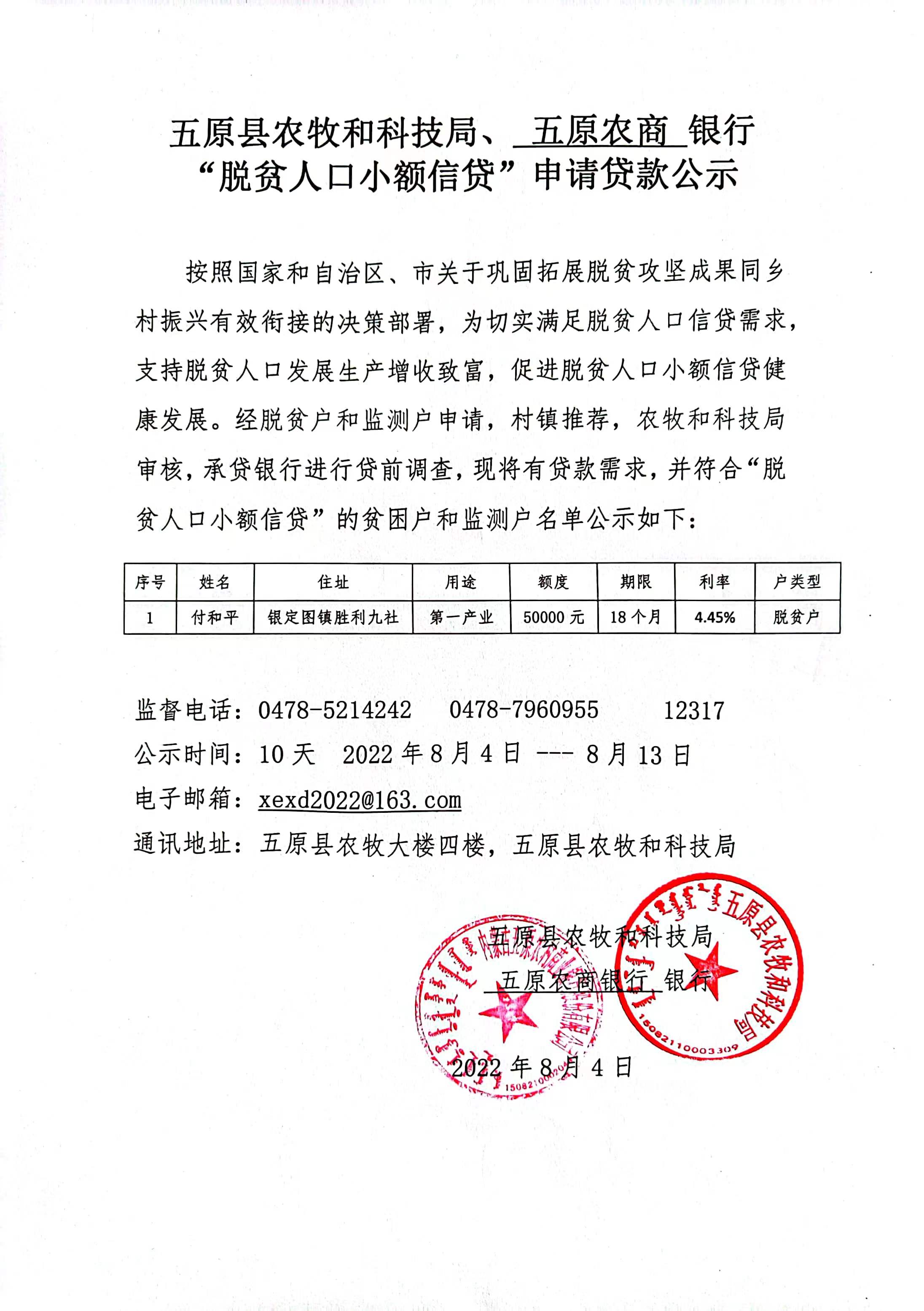 五原县农牧和科技局、五原农商银行“脱贫人口小额信贷”申请贷款公示