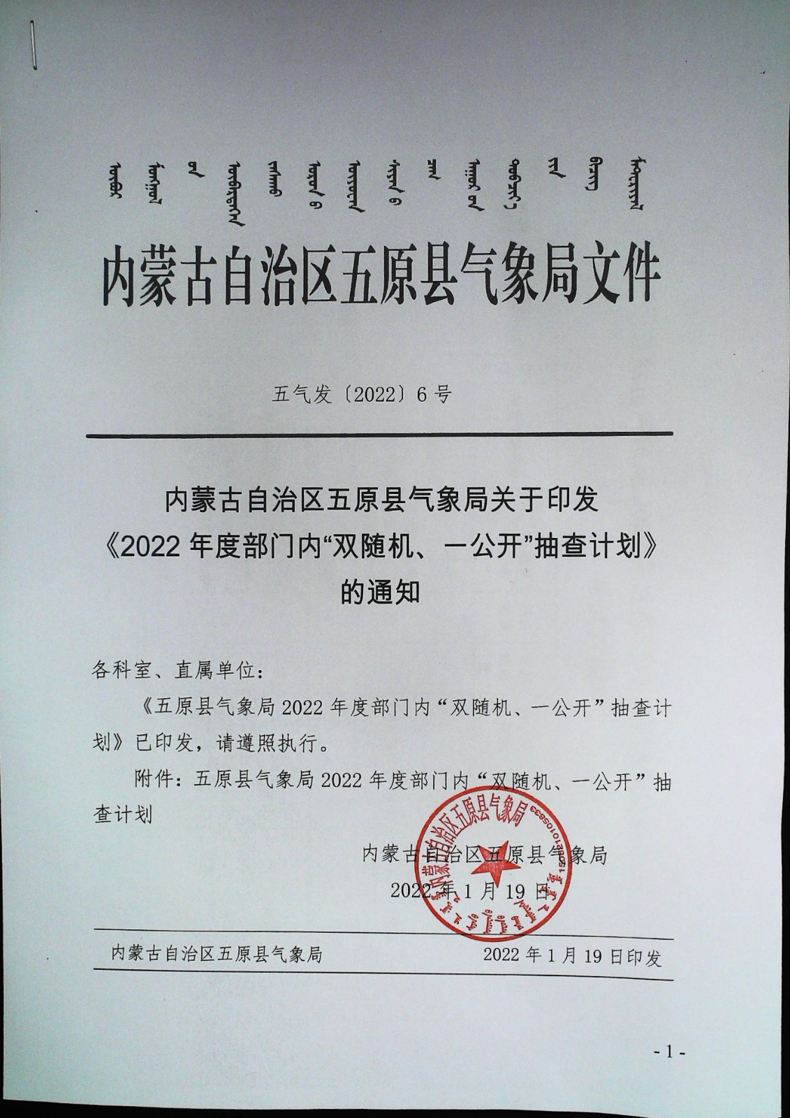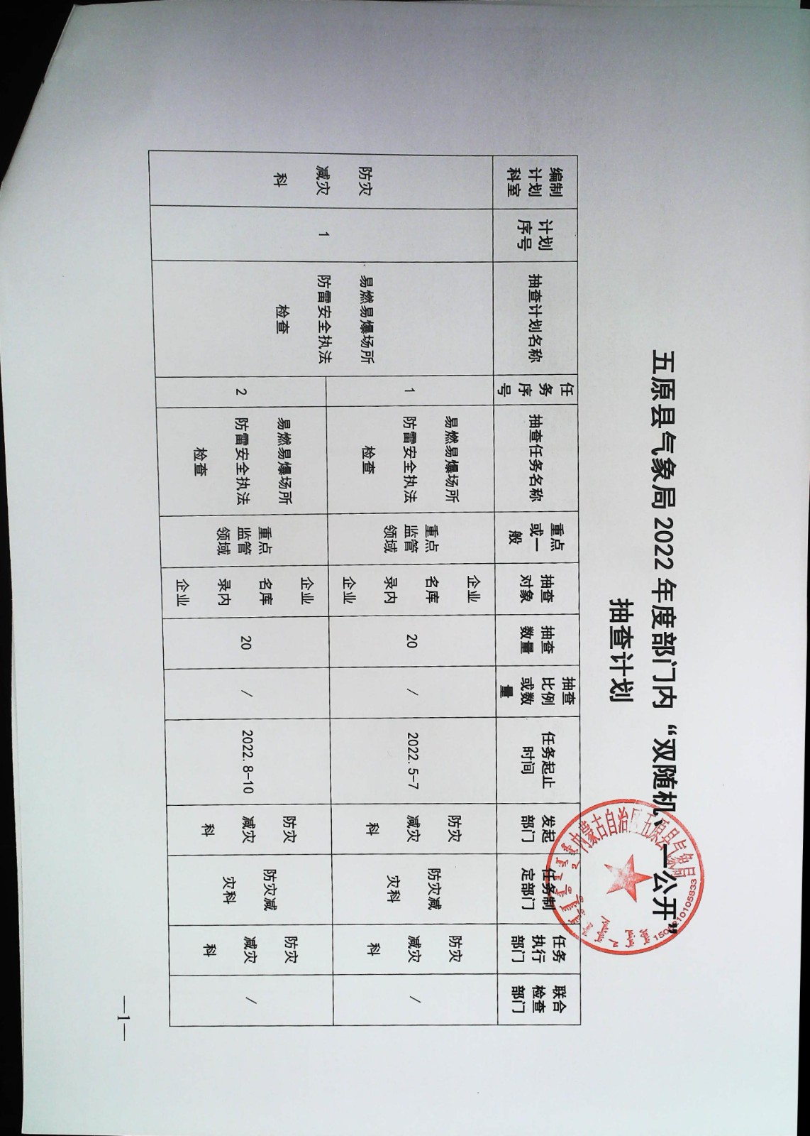 五原县气象局2022年度部门内“双随机、一公开”抽查计划