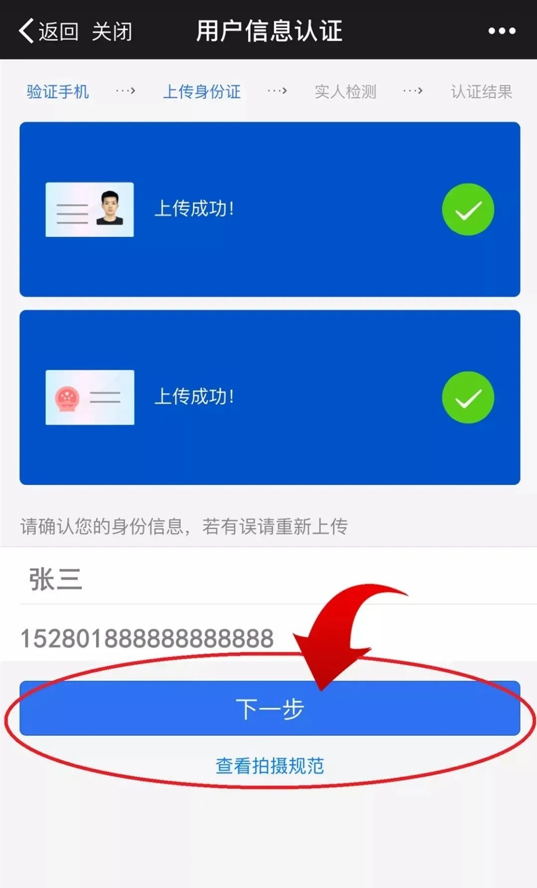 3.上传身份证照片后,姓名或身份证号码识别不正确:需重新拍摄符合要求的照片并上传(拍摄规范:身份证照片边角完整、字迹清晰,拍摄过程关闭闪光灯);