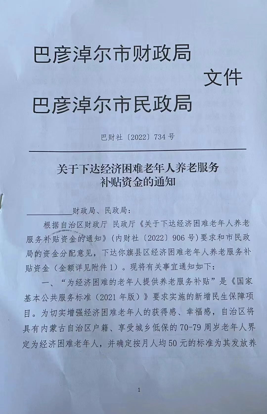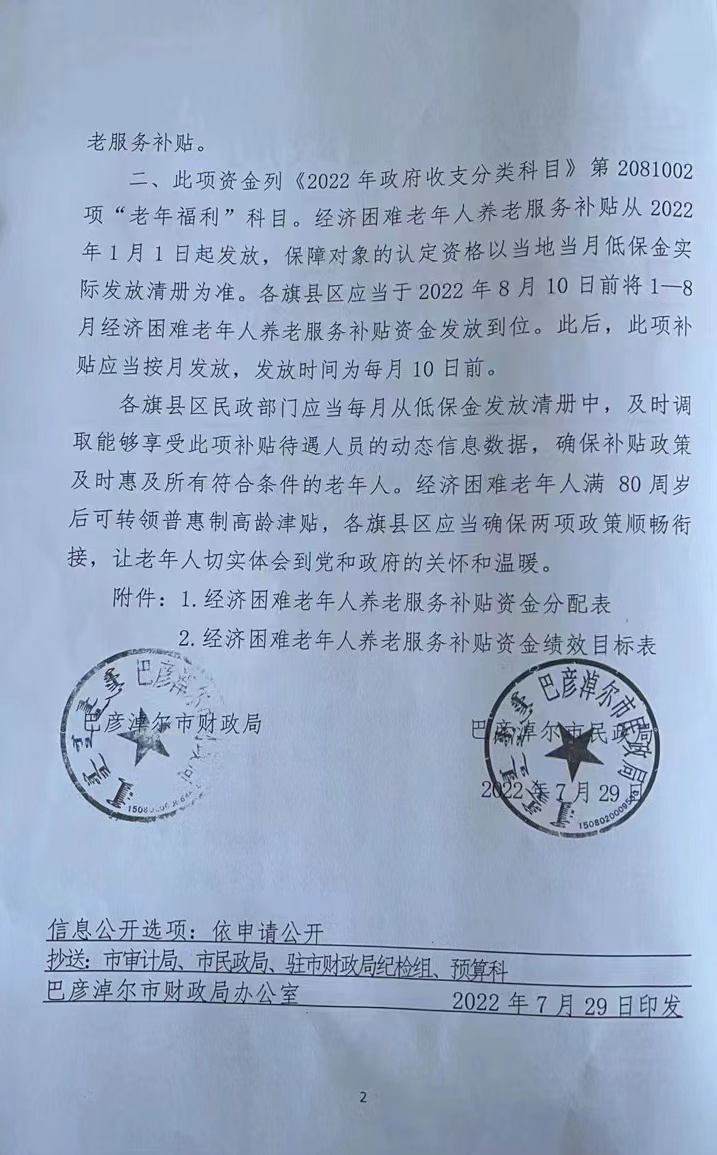 关于下达经济困难老年人养老服务补贴资金的通知