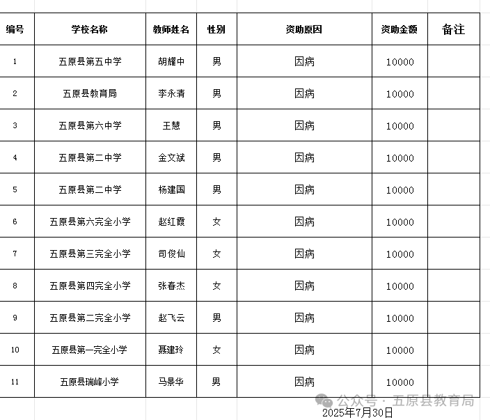 通过五原县教育局中央专项彩票公益金教育助学项目实施领导小组,对全县各学校、幼儿园提交的“2025年励耕计划”申请材料进行审核,拟对以下(11)名家庭经济困难教师进行资助,特此公告。