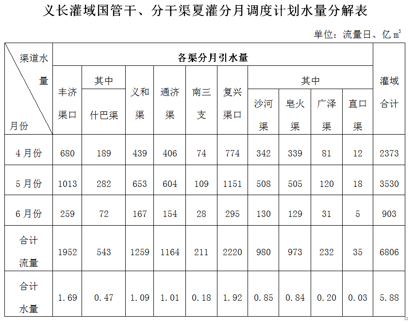 (二)计划水量。考虑到今年夏灌需水量增加的实际,灌区安排夏灌计划调度水量18亿立方米(含指标水量),并结合黄委月调度计划分月控制运行。分配义长灌域夏灌计划调度水量6806个流量日(合5.88亿立方米),分月调度计划水量:4月份2373个流量日(合2.